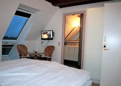 We have 4 lovely rooms with private toilet and bath facilities, TV, blackout curtains and Wi-Fi. The rooms are located in the west-facing wing with a fantastic view to Kerteminde fjord. The rooms are equipped with a double bed, a small table and two chairs.